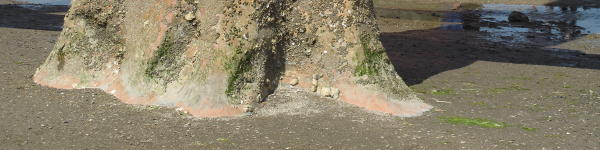 Concrete footings Driven piles going up inside each leg Large steel pins deep into the soil It isn't - it just sits on the sand I have no idea