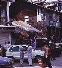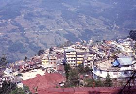 Gantok is a little like Darjeeling, but seemed more appealing. Depite the abundance of grey concrete buildings, we rapidly grew to like the town and the people we met. It is more Buddhist, with prayer flags in evidence on many buildings, and the people are mainly Tibetan or Nepalese. Aunty, in Darjeeling, had recommended the Tibet Hotel, run by the Dalai Lama's staff, so we set off to book in, dump our gear there, and do some initial sounding out of trekking agencies. On that first day we sowed the seed of our interest in trekking with three agencies - Tashila, Yak and Yeti, and Mountain Tours. In all cases we were met with the same information - we required a group of four (minimum), and cost was fixed by the government: $US35 per person per day. We suggested that they may join us up with other single travellers, if anyone else appeared interested.