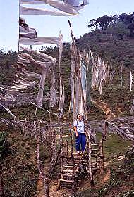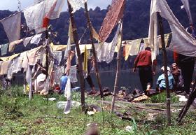 The next day we began our trek, the four of us accompanied by our guide (Dorjee), his off-sider, a policeman (obligatory in this politically sesitive part of the world), a cook, four kitchen hands, four porters, a yak man and four dzos (a cross between yak and cattle). The first day was relatively easy, 16 kilometres from Yuksam (1780 metres) to Bakkhim (3005 metres) through lovely countryside, initially up a valley, then across the stream and up the hill to a forestry station, where we slept on bare-board beds, cold and comfortless, after a magnificent meal cooked by "the boys" in a miserly little lean-to in the nearby paddock. Bakkhim to Tsokha the next day was very short and VERY steep. About two or three kilometres, but it took us about three hours to do it! To add to the joy, I started to show sign of altitude sickness; three steps up, stop and vomit, then plod on again.