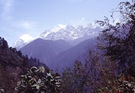 Our destination was Dzongri (4030 metres), only ten kilometres away, but another steep climb. This would have to be some of the most beautiful forest in the world - massed flowering rhododendrons and magnolias, amid fir and spruce trees, with orchids in the trees, deep mosses and lichens, and thick, thick ferns on the forest floor. The crew went first, and stopped at Phithang (about the only flat spot along the way) to cook and serve lunch. They did a fantastic job, cooking on open fires, producing a full seven-course meal. As we climbed higher the cold set in, and it was snowing by the time we arrived at the hut in Dzongri. There is no village this high up the mountains - it is a yak high pasture, with one hut for the yak herder, and the trekker's hut nestles by a stream in a valley. The best view of Kanchenjunga is from a hill to the north-east, another 1000 foot climb. We had a bit of a walk around the valley after arriving, but the cold and dark sent us indoors. If anything, it was colder inside! We ate our usual great meal early, and all four of us retired to our sleeping bags to shiver the night away.