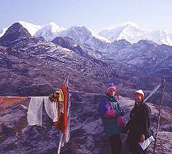 Early next morning we were up to climb the hill, hoping to see the mountains at sunrise. The climb took a surprising long time, lungs gasping in the thin air, but it was well worth it; Kanchenjunga seemed to be only a valley away, looming over us with its five peaks turning pink and gold in the early morning light. This is what these trip are all about - a sense of awe that is almost religious when you stand near the top of the world and look out on it spread in front of you.