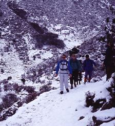 The snow was still falling when we got up, and lay heavy on the ground - enough to build snowmen when it eased off. To Geoff and I from Western Australia, where it never really snows, the sight was overwhelming, and we made many forays out and up onto the ridge, enjoying the novelty. The sky lightened, but Dorjee was reluctant to set off down the mountain. We were not looking forward to another frozen night, and after much debate again voted with our feet and said that we would descend to Tsokha. In the event we were right. Although we left in light snow, it eased off rapidly, and before we were half way to Tsokha I was once again walking in a t-shirt, rather than in the multi-layered clothes I wore at Dzongri. The walk down was wonderful, with snow laying on the stunted rhododendrons that grow at these altitudes, softening the forest still further.
