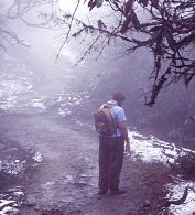 From Tsokha we were to walk to Yuksam, not stopping at Bakhim. Geoff and I were out in front as we headed down the hill, but we could hear Anke and Harm not far behind us. This wasn't unusual - we tended to walk in changing pairs or groups, different people taking the lead as suited them, and normally without sight of the trekking company people at all; the policeman usually walked somewhere near us, but not always. After a short time, we sat and waited for Anke and Harm to catch us up, but no-one appeared. After ten minutes we began to worry, then Geoff climbed back up the hill to investigate. Eventually I joined him, and we walked back to Tsokha, now deserted by all the crew. About this stage we concluded that we had taken the wrong route in the first place, and headed down again, this time seeing a side track just as the main track took a bend. When we had first walked down here we had been passed by people on horse-back at this corner, pushing us into the cliff side of the bend, and hadn't even seen the track going off. We headed down this new route, looking for signs that we were on the correct path. Harm's boots had a distinctive sole pattern, but we couldn't see it in the mud. We sped down the trail, but never saw a soul. The climb that had taken three hours on the way up was reduced to about 20 minutes to get down, and we arrive at Bakhim, expecting to see the group. No, there was no-one and no evidence that they had passed though. There was no alternative but to press on, down the steep drop to the river, where we left a pile of rocks with a note, in case we were wrong, and the rest of the party were behind us.
