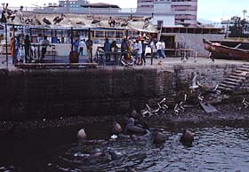 We were heading back to the coast - first to Calama, then on to Antofagasta, another port city. It is reminiscent of Iquique, crammed between hills and ocean, sea lions swimming in the harbour. The fish market attracted thousands of pelicans, vying with the sea lions for the scraps. Our hotel room was across the street from a loud disco, pumping music into the night until 4am. On the positive side, this gave us lots of time to sit in the window and appreciate the giant illuminated advertisments that ran across the entire massive hillside behind the town.