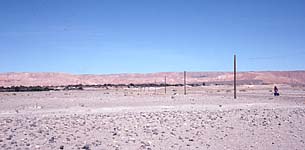The free zone (zona franca) attracts lots of Chileans to Iquique, and the bus station was crowded with people carting huge parcels and bags, all of which had somehow to fit into the bus. Eventually we all crammed in, and set off across the desert for Calama. It was hot down by the coast, and didn't get much cooler when we headed in to the mountains. We detoured into Chuquicamata, Chile's major copper mine. It seemed a souless place, the dusty streets deserted, and the barracks-like public housing looking like something out of a concentration camp, numbers branded on each building.
