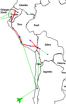 Guayaquil itself wan't an attraction for us, although had the railway to Quito been running it would have provided the start point for a trip into the mountains. However, the railway line, like everything else, had been washed away with the floods, and we were in Guayaquil in order to get a flight to the Galapagos Islands. All the information we could find said that there were no banks on the islands, so we had to be heavily cashed up before we left, particularly as we were only buying a one-way ticket to the islands, and planned to buy our return ticket to Quito once we got to Santa Cruz, not knowing how much time would spend out there. We went to the local cambio to cash traveller's cheques. Only after we had signed them did the staff tell that that they only small denomination notes. Our hundreds of $US turned into thousands of sucre notes, far too bulky to fit into our money pouches, and the passing Ecuadoreans stopped to oggle as Geoff stuffed money up his shirt and down his daks and I loaded up my bra!