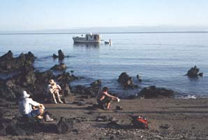 The first day we anchored off the island, and walked around to see the flightless cormorants, followed by a swim with the sharks. That night we slept on the boat, and made an early landing to climb to the top of Alcedo. Geoff seemed to suffering a recurrence of his gastric upset, or had contracted a virus - in any case, he became quite ill on the way up, so much so that I took the contents of his pack, and even then he decided to go back down and join the boat. Looking back down the slope he could see the boat had already left the shore - the crew had decided to take off for the two days we were on the island, so poor Geoff had to struggle to the top. And it was a struggle. The lower slopes are barren lava flows and less steep, but as you get further up the volcano the vegetation starts to thin and the slope gets steeper and steeper. Right at the top it was a very hard climb through quite dense vegetation and Geoff was totally stuffed by the time we set up camp. The volcano is quite high and creates its own microclimate, with moisture from the misty clouds that shroud it making it a choice place for plants and the tortoises to live. A live fumerole steamed on the other side of the crater, and we resolved to walk around the rim in the morning before making our descent. In the meantime we had giant tortoises around the camp, and apart from poor long-suffering Geoff we were having a great time.