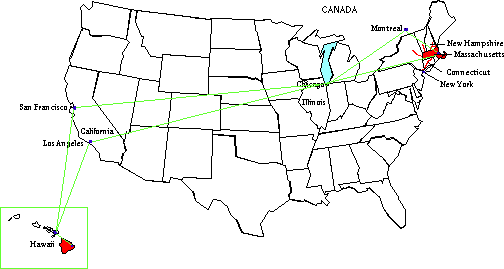We hired a Volkswagen "rent-a-wreck" beetle and Geoff had to drive me back and forth to work, leaving him free to explore Boston and the surrounding countryside during the day. It was autumn, and the leaves were turning just after we arrived, presenting us with stunning scenes of neat little New England towns on placid lakes, surrounded with firey day-glo trees. On the weekends, provided the wreck didn't break down, we drove around the local area or went into Boston, giving me a break from study and a look at some of the places that Geoff had found out about in his free time. We managed to see a fair bit of Massachusetts, and some of the surrounding states.